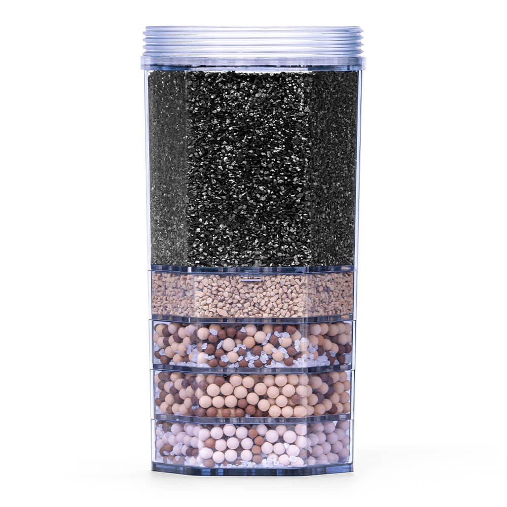 La primera capa, que es la más grande, contiene carbón activado de alto rendimiento, que es un excelente filtro para medicamentos, pesticidas, metales pesados y otros contaminantes.